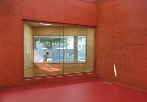Toute l’enveloppe extérieure du bâtiment est en béton apparent blanc et à l’intérieur, les trois tours communes sont réalisées en béton teinté dans la masse rouge, orange et jaune.