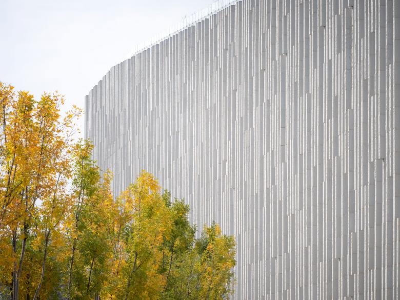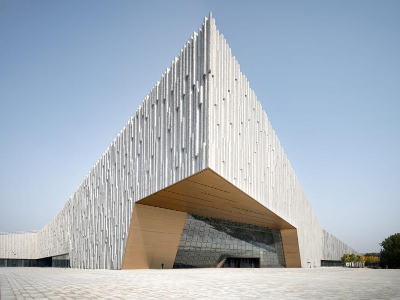The museum’s curtain wall façade of natural stone, with its vertical rhythm and sculptural relief, has been built by using a modular system of prefabricated elements, the façade’s rhythmic texture is designed to echo the flow of the river. While public zones are punctuated by slender vertical windows that admit natural light, the exhibition spaces are shielded from direct light. Three large windows on the north side reference the Yellow River’s iconic cave dwellings and frame sweeping views of the landscape.