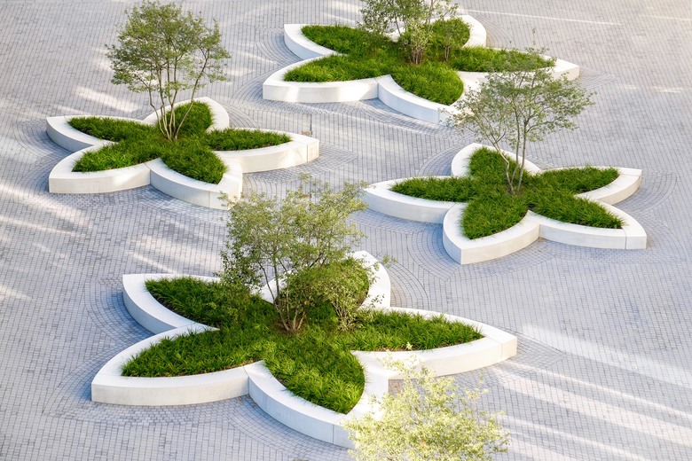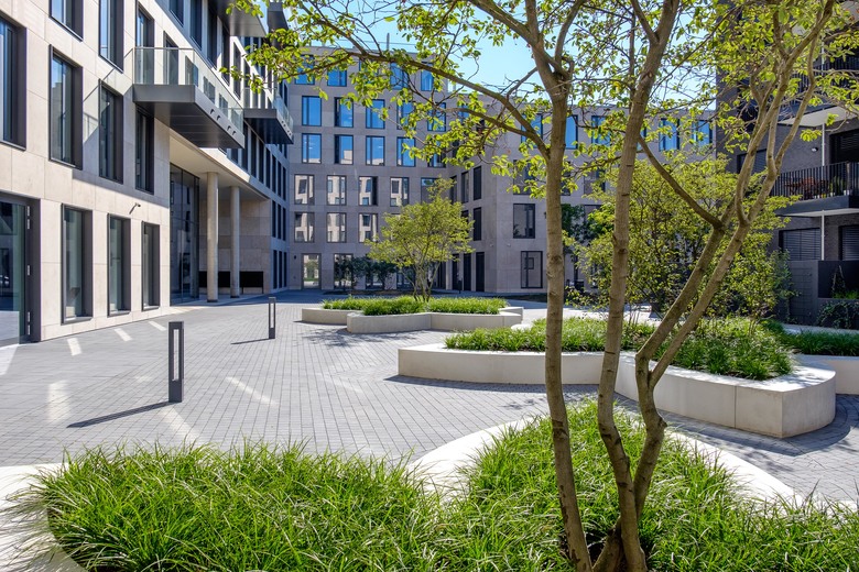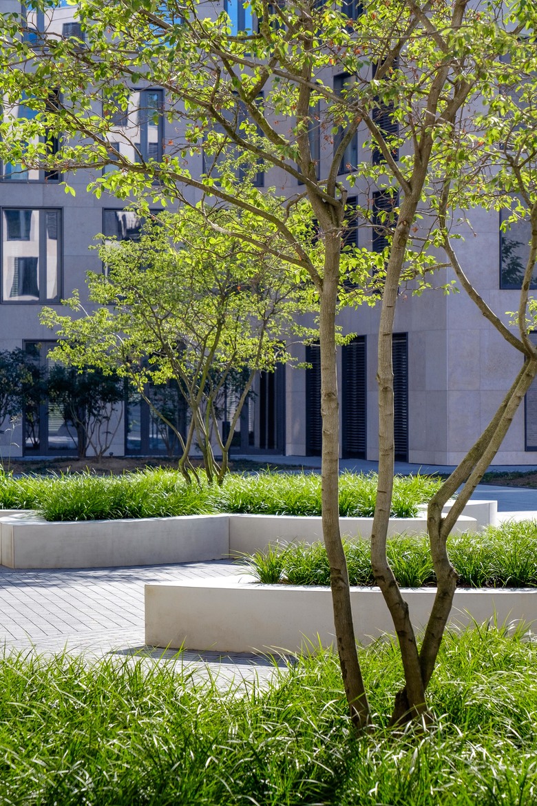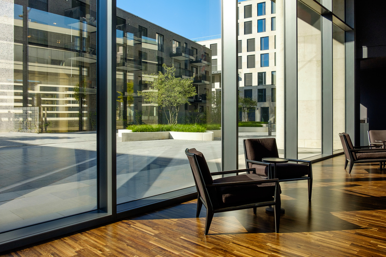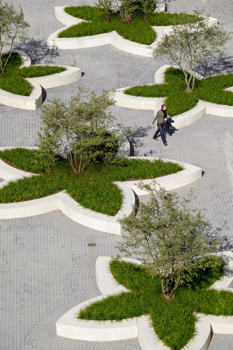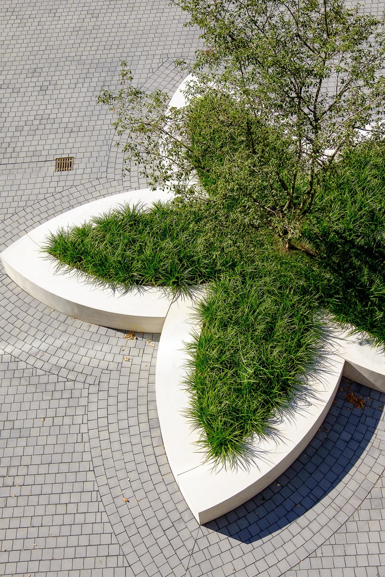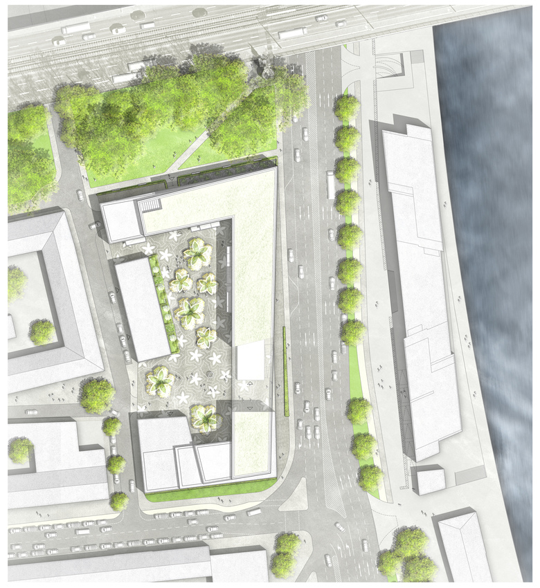 In einer sich öffnenden Geste formuliert die neue Fußgängerpassage zwischen dem „Katharinengraben“ und der „Holzwerft“ im Eingangsbereich des Bürogebäudes einen repräsentativen, öffentlichen Platz. Einladend breitet sich ein durch ein Messingband eingefasster „Teppich“ aus Natursteinplatten auf der Platzfläche aus. Die räumliche Differenzierung zum halböffentlichen Bereich des grüngeprägten „Gartenhofes“ wird durch eine Geländemodellierung erreicht. Im Innenhof bilden die Pflanzinseln in Blütenform einen spielerischen Kontrast zur ansonsten geradlinigen Architektur. Die breite Einfassung der Inseln bietet zudem Sitzfläche und lädt so zum Verweilen ein. Insgesamt entsteht im Innenhof der neuen Gebäude am Weichserhof eine offene, kommunikative und urbane Atmosphäre.