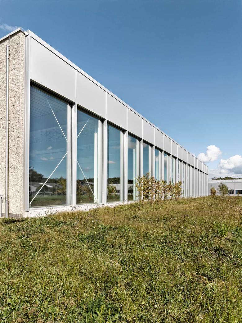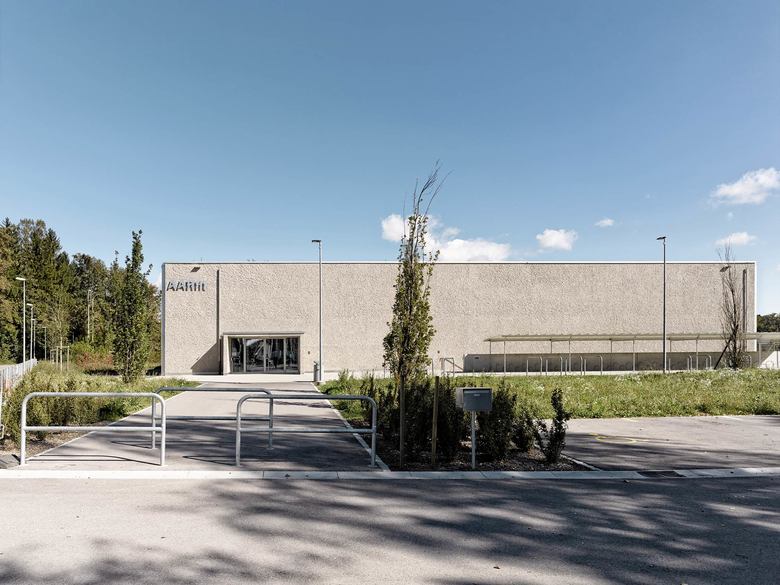 Die neue Mehrzweckhalle befindet sich im Übergang des Schulareales zur Industrie in einer parkartigen Umgebung. Der Neubau wird von Baumgruppen und dem angrenzenden Wald gefasst und schliesst die Aussensportanlagen des Gebietes Chräjeninsel zum Industriegebiet hin ab. Feingliedrige Glasflächen auf der Nord- und Südseite reflektieren die Umgebung und lassen durch ihre Transparenz den Blick, je nach Lichtstand, quer durch das Gebäude zu.