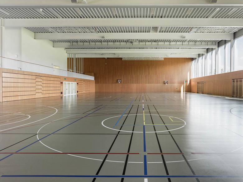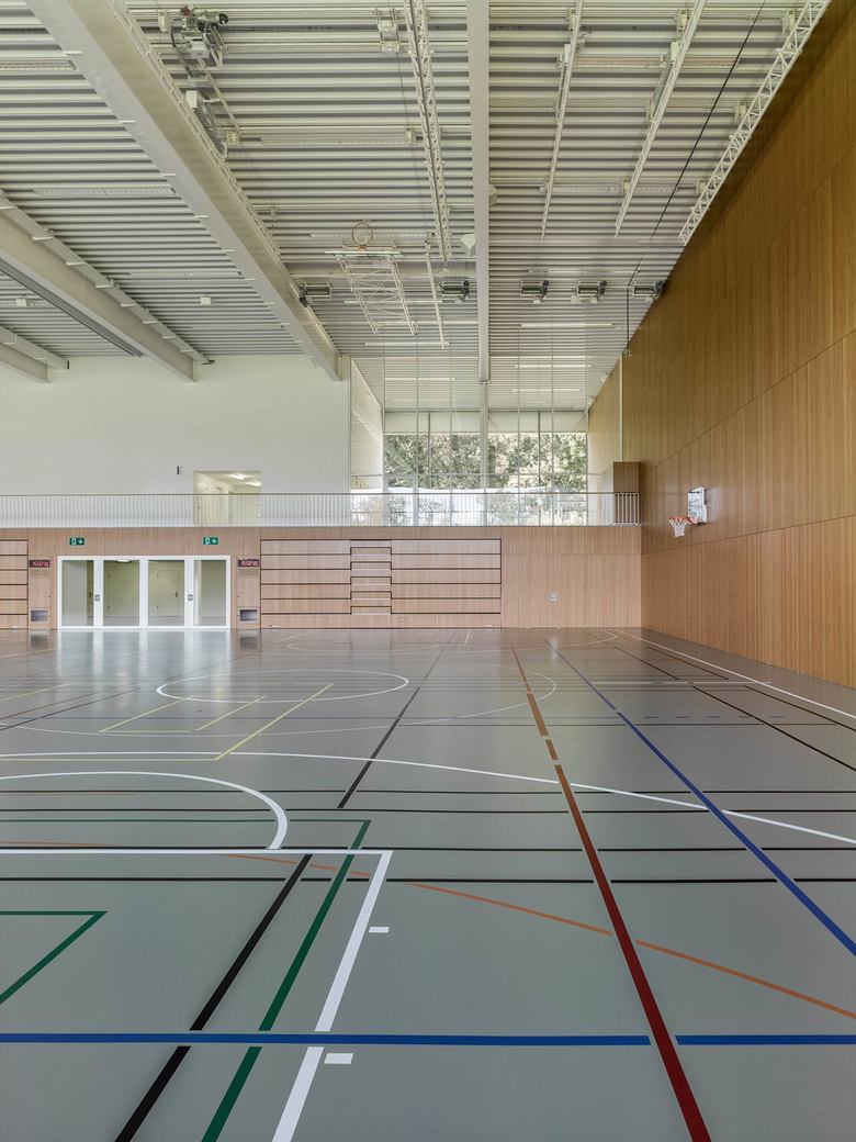 Im Gegensatz dazu sind die beiden Seitenfassaden mit einem groben, zweifarbigen Kellenwurfputz behandelt. Die erdigen Farben nehmen Bezug auf die Natur und fügen das Gebäude selbstverständlich in den Grünraum ein. Im Innenraum schaffen die mit Douglasienholz bekleideten Wandflächen und der helle Kunststeinboden eine warme Atmosphäre. Die weiss gehaltenen Betonflächen und Stahlstrukturen sowie der grüne Sportboden werden mit den Ausblicken in die parkartige Umgebung ergänzt.