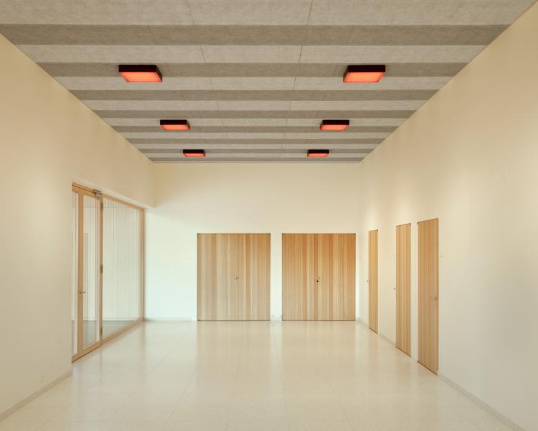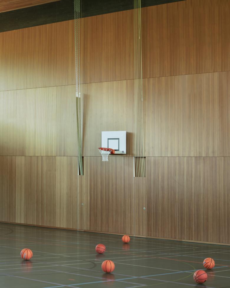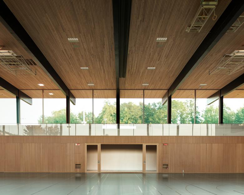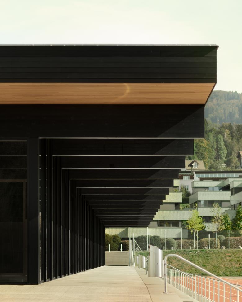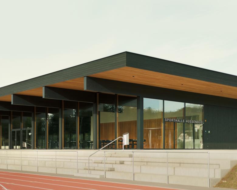 Die Sportanlage Hüssenbüel liegt am Dorfrand von Hinwil im Übergang zum Wald und Naturschutzgebiet. Eingebettet in die Mitte der Aussensportflächen wird mit dem Neubau das Zentrum der Anlage geschaffen. Der filigrane Hallenbau mit allseitig auskragendem Vordach wird dabei zum identitätsstiftenden Element der Gesamtanlage.