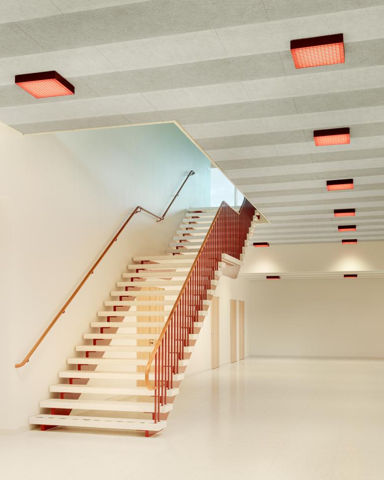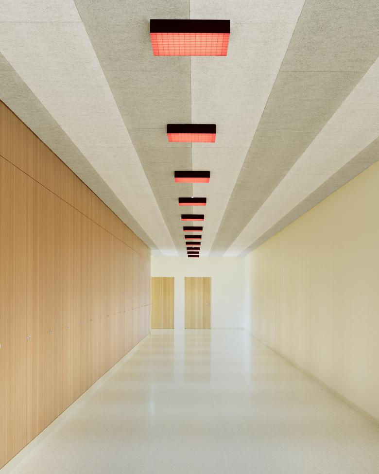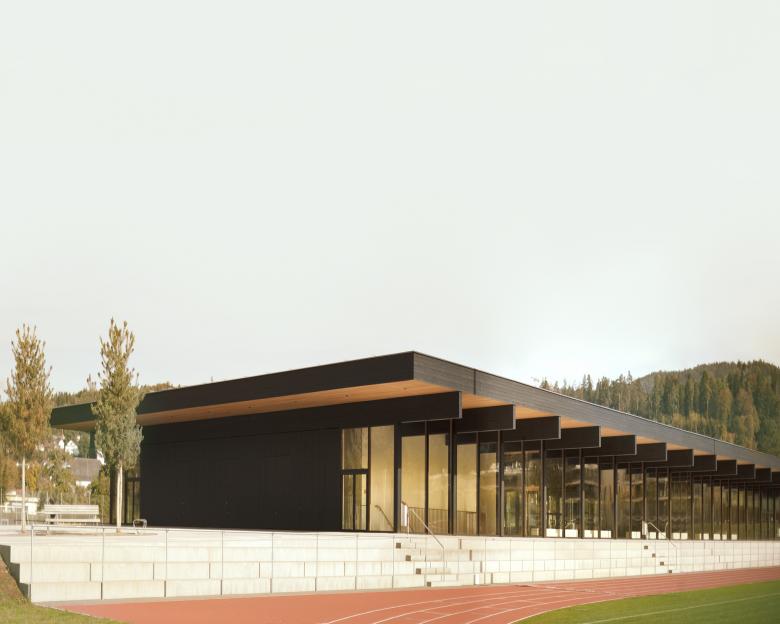 Alle Nutzungen der neuen Sporthalle werden unter einem grossen Dach zusammengefasst. Das Dach überdeckt ein Plateau, welches sich zwischen dem Kunstrasenspielfeld und der Vierhundertmeteranlage aufspannt und sämtliche Publikumsräume für den Innen- und Aussensport aufnimmt. Getragen wird das Dach von zwei lateralen Kernen mit den zudienenden Nebenräumen. Im Zentrum liegt der abgesenkte grosse Hallenraum. Das Foyer reicht über die gesamte Hallenbreite und erschliesst sämtliche Zuschauerbereiche für den Innen- und Aussensport.