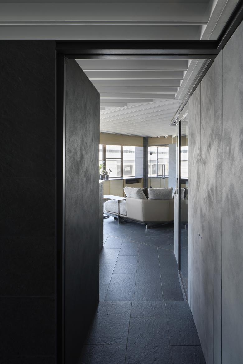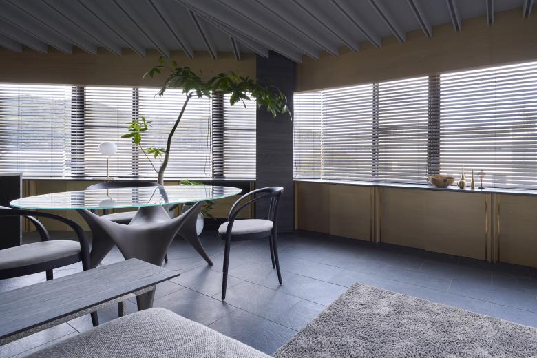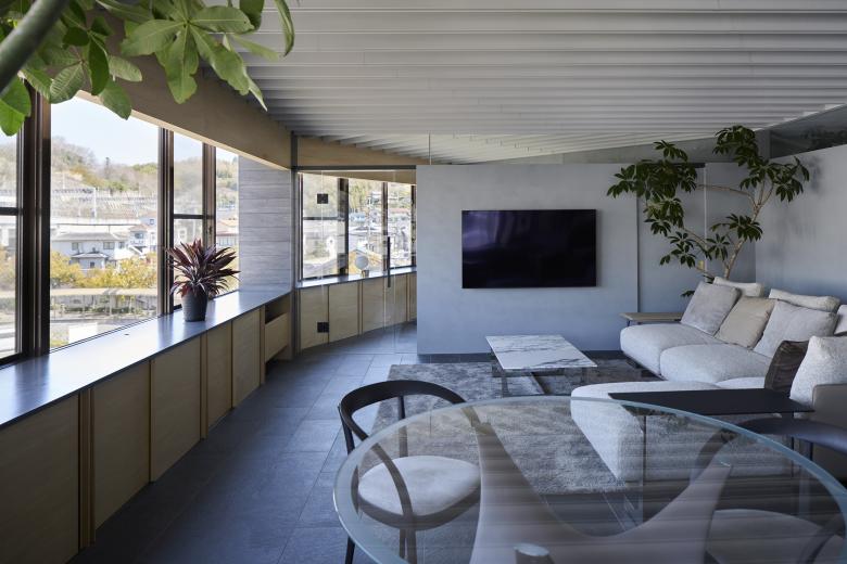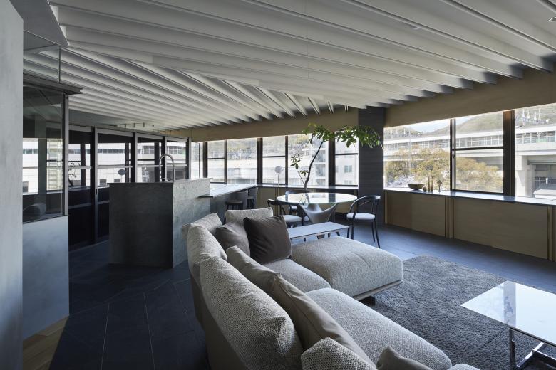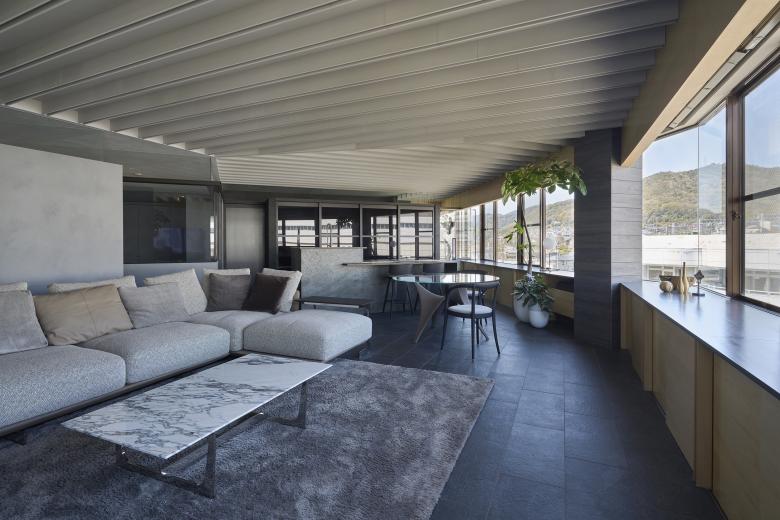 Onomichi is associated with a seaside townscape, but the site is located on the inland side of the city. Although the building was intended as a building, the top floor was originally planned as a residence, and was renovated to suit the lifestyle of the new residents. The building has a fan-shaped exterior that matches the shape of the site, and is characterized by a series of panoramic openings, and we aimed to create a space that maximizes the enjoyment of this expanse. The composition of the building is as follows