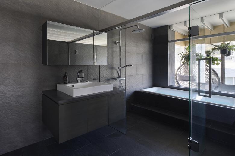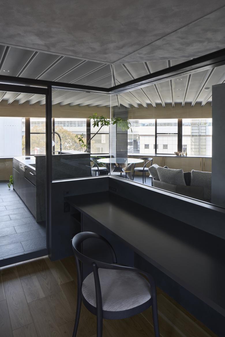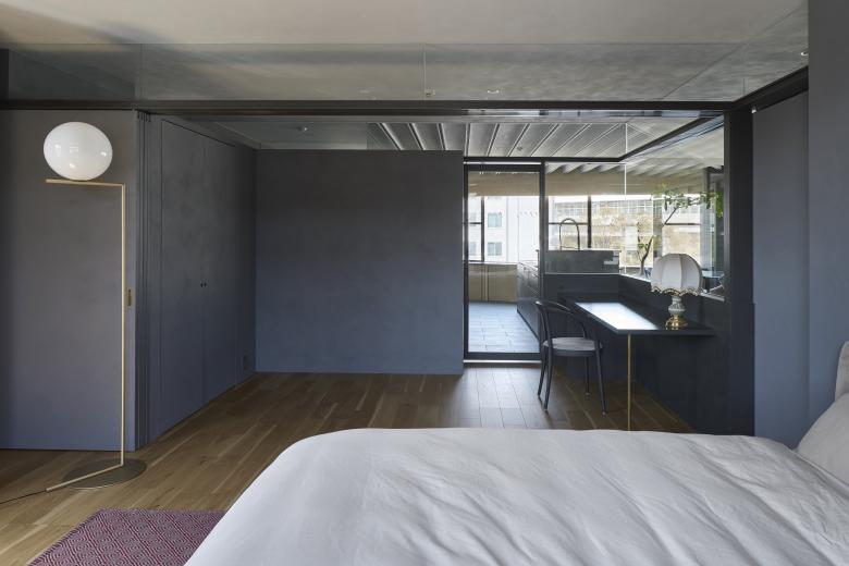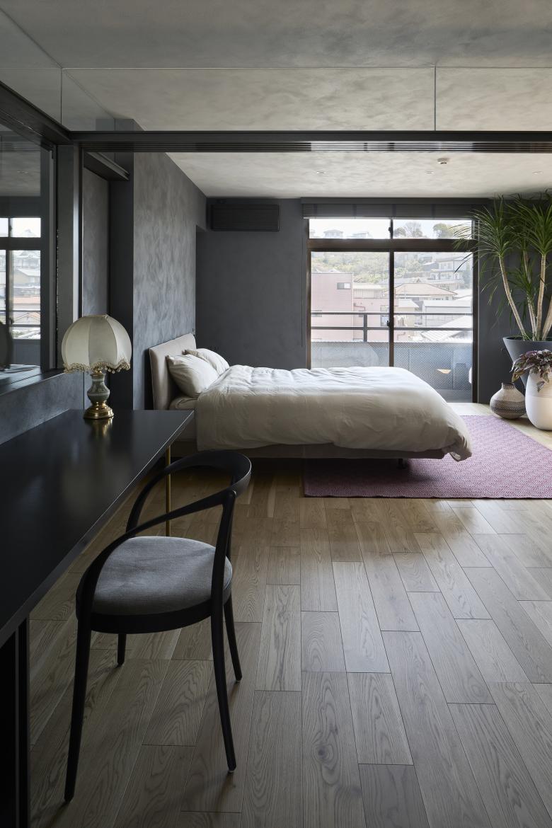 The above actions created a space that satisfies openness, continuity, and daylight control. In addition, as has been the practice in previous house renovations, the ceilings between the rooms are made continuous by using glass between the railing above the fixtures, and the ceiling surfaces of the partition walls are also made of glass, creating a state of connection despite the partitioning. The bathroom is protected by the inner terrace in the foreground, where one can enjoy the view of the mountain range. In the bedroom, the glass from the waist wall up connects the living room with the view of the mountains beyond.