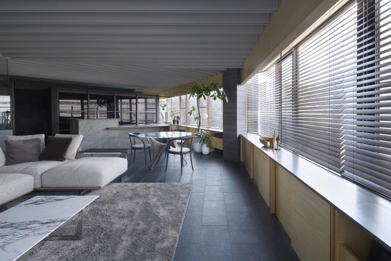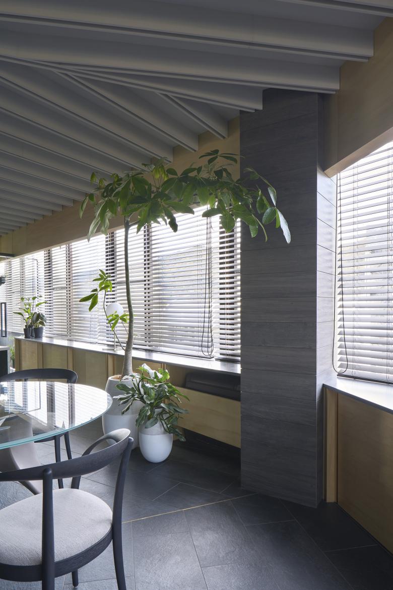 The opening of the window is made to seem large in relation to the size of the room, so a hanging wall is built in front of the window to adjust the amount of opening, and the storage space is continuous up to the waist wall.