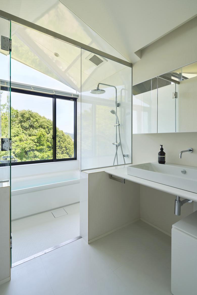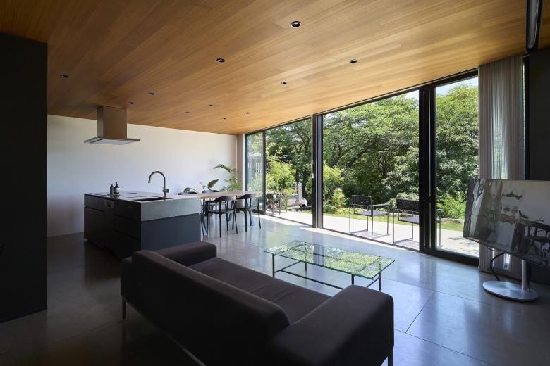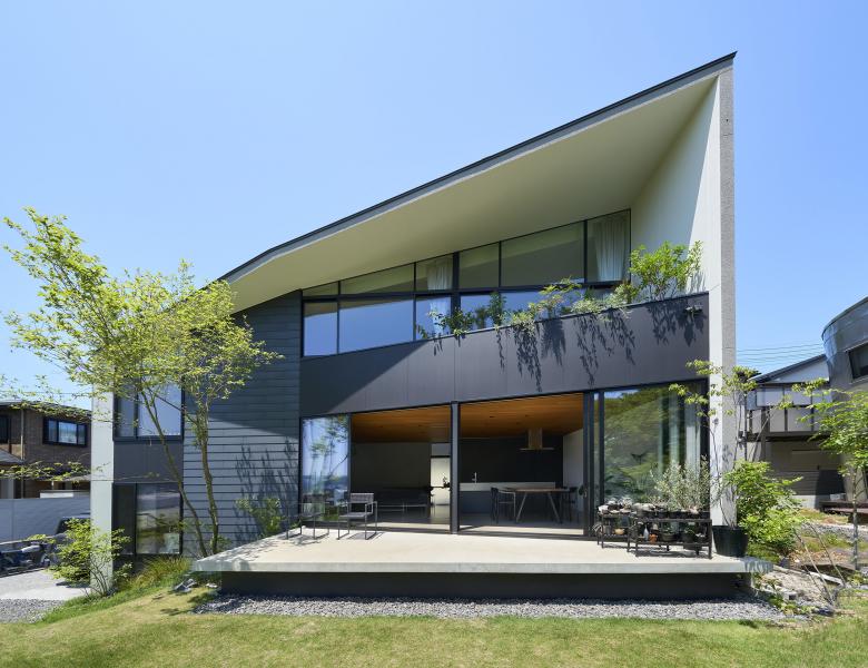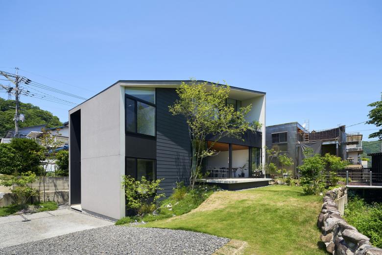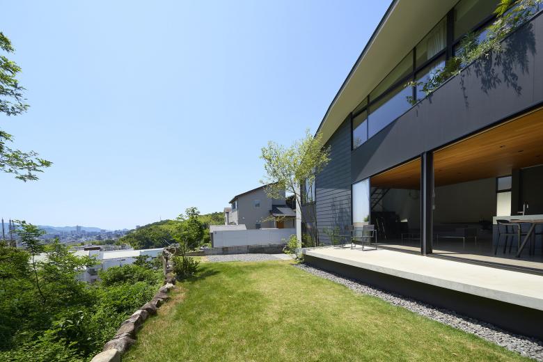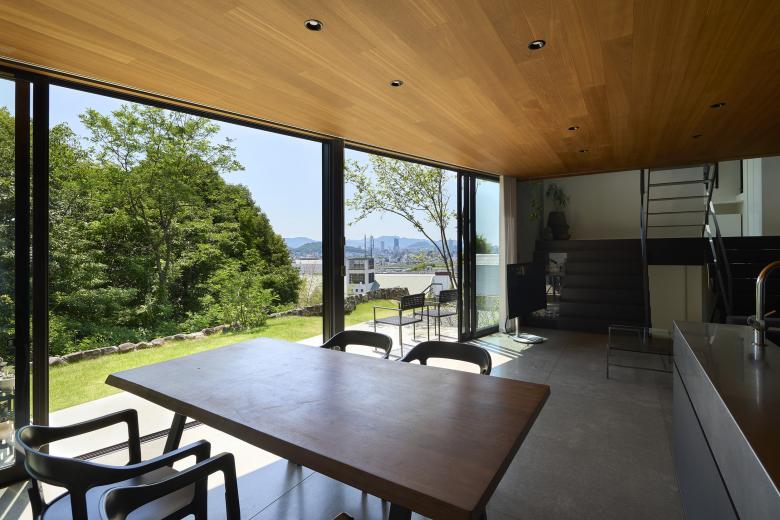 This house is located in a residential area that was built along the slope of a hillside in the middle of a mountain forest. Hiroshima City has many such residential areas, and the streetscape is gradually being updated as the population ages. The site has an unobstructed view from the east to the south in the foreground. To the east, there is also an old-growth forest left over from land development, and the distance between the site and the neighboring land was kept at a reasonable level.