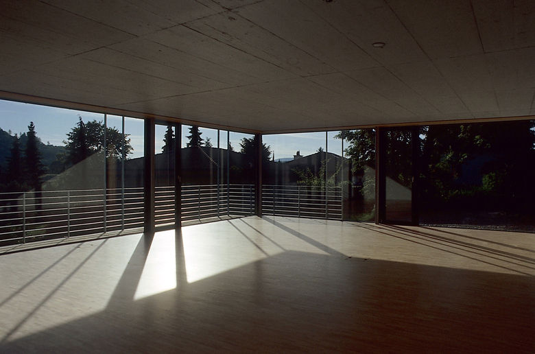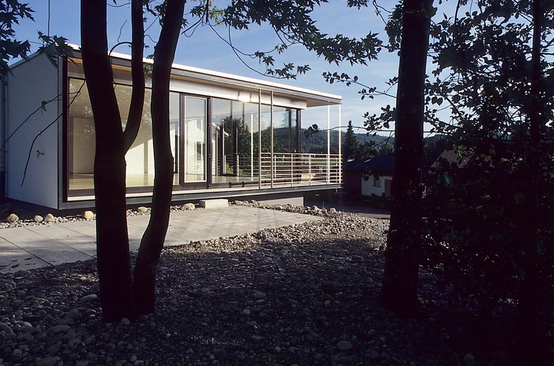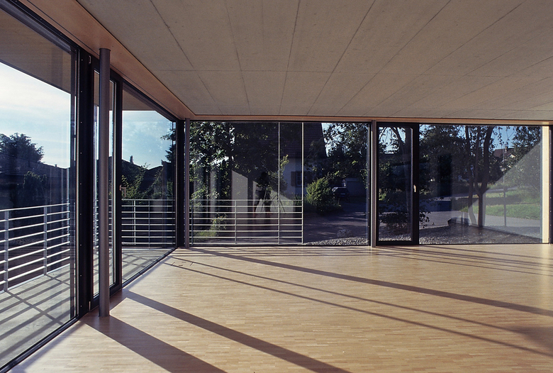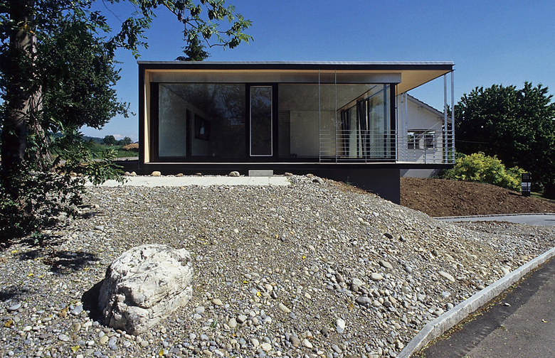 Auf dem Restgrundstück einer bestehenden Liegenschaft sollte ein Büroatelier gebaut werden, welches später in eine Wohnung umgewandelt werden kann. Balkon und Dachvorsprünge bieten eine gewisse Geborgenheit an dieser Lage. Sie sind die vorgelagerte Fortsetzung des Innenraums nach aussen. Die rahmenlos wirkenden Fenster unterstützen den fast nahtlosen Übergang von innen nach aussen.