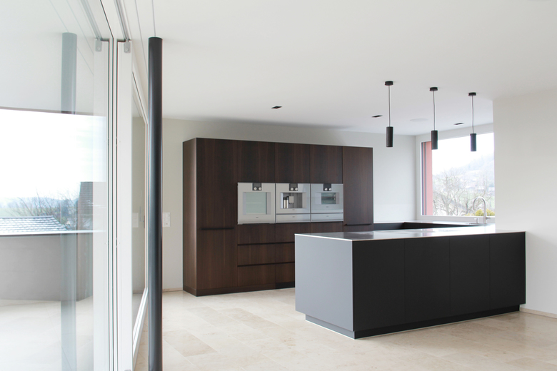 Von innen nimmt man nicht wahr, dass die Talseite verbaut ist. Das liegt am vorstehenden Küchentrakt, welcher das vorgelagerte Haus vollständig abdeckt. Mit diesem Vorbau entsteht ein intimer Hof, welcher die Sicht in die andere Richtung leitet wo sie sehr schön ist. Zudem lässt sich das 6-Personenhaus mit wenigen Eingriffen in zwei komplett getrennte Wohnungen unterteilen: Eine mit Aussichtsterrasse im OG, die andere mit dem Gartenatrium im EG. Somit kann die Bauherrschaft noch sehr lange ihren Garten geniessen.