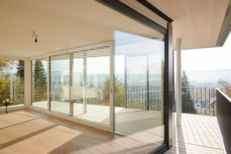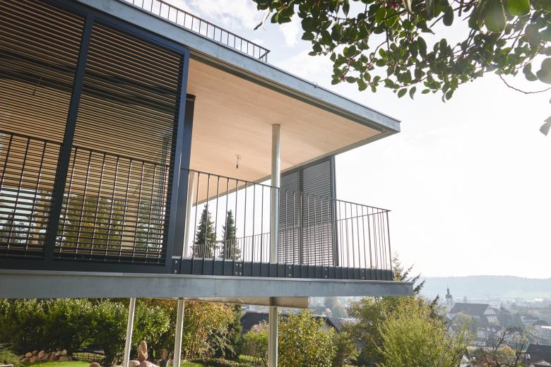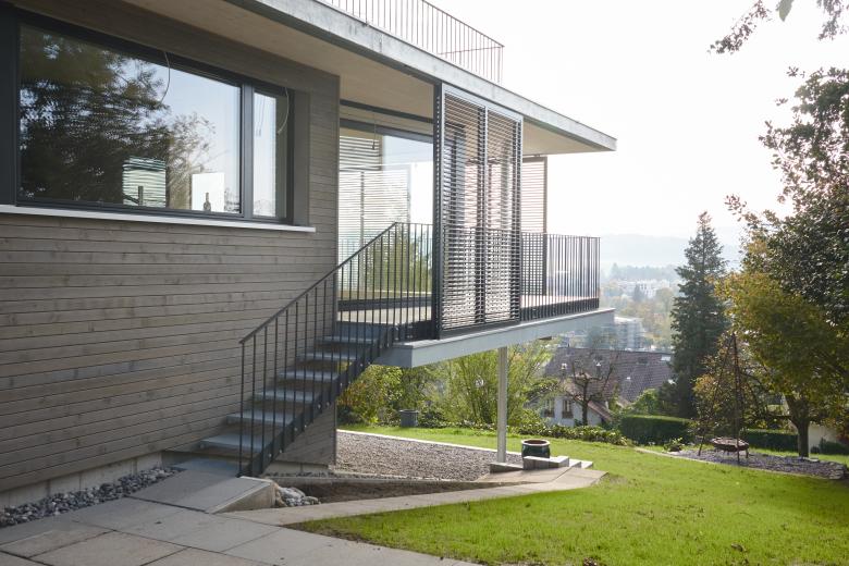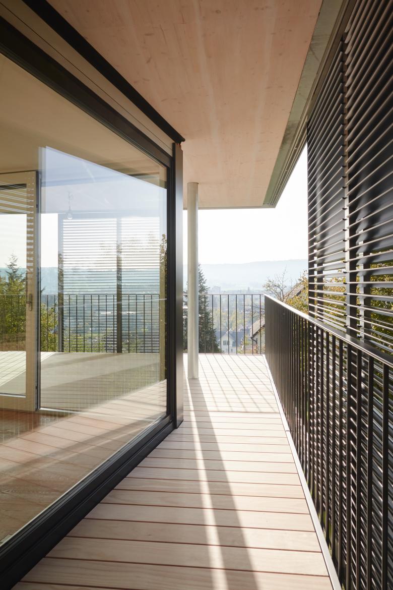 Hoch über Wohlen tront eine ältere Liegenschaft an einer aussergewöhnlich schönen Lage, jedoch mit einer für die Bedürfnisse der Bauherrschaft viel zu kleinen Wohnung. Das Konzept «fliegender Anbau» löst das Problem radikal: Alle Aufenthaltsbereiche werden durch grosszügige Verglasungen lichtdurchflutet und verfügen neu über eine wunderbare Aussicht. Der Innenraum wird durch die durchgehende Terrassengestaltung räumlich bis an die Schiebeläden erweitert. Als frei veränderbarer Filter von Licht und Sicht lassen sich mit ihnen geborgenere oder offenere Wohnstimmungen erzeugen.