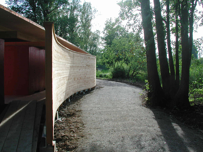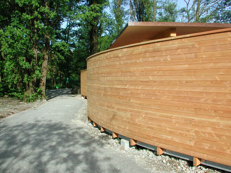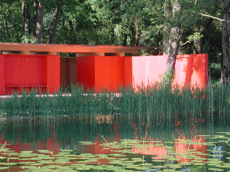 An diesem unberührten Ort verschwindet der behutsame Landschaftseingriff fast vollständig, indem die Anlage in verschiedene architektonische Elemente aufgegliedert wurde. Durch das wechselseitige Zusammenspiel des einfachen Baukörpers mit der nischenbildenden Wand, welche sich dem Weg entlang schmiegt, strahlt die Anlage Geborgenheit und Stille aus.