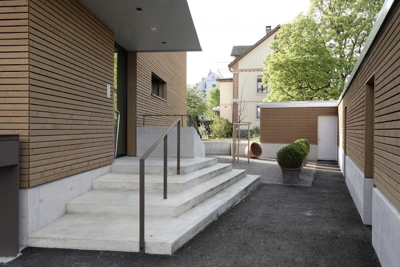 Das Projekt besteht aus drei Wohnungen auf drei Geschossen. Die nach oben abnehmenden Wohnflächen ermöglichen grosszügige Aussenräume für alle Wohnungen. In der Fassadengestaltung wird diese Schichtung und Rückversetzung durch die horizontalen Brüstungsbänder betont. Die markant, über die gesamte Gebäudehöhe verlaufende Betonwand verweist auf das verbindende Treppenhaus und bildet gleichzeitig Anker und Ausgangspunkt für die Brüstungsbänder.