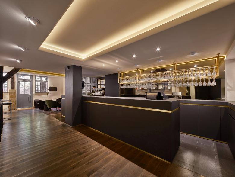 Eine besondere Herausforderung stellte die vorhandene Decke dar, die zuvor unruhig und mit vielen Versprüngen gestaltet war. Zudem sollten markante Designelemente übernommen werden, um die Verbindung zum Stuttgarter Laden zu bewahren. Dazu gehörten der Georges-Aufdruck auf dem Parsolspiegel, das messingfarbene Glasregal für die Sektgläser, die schwarz-messingfarbene Theke und die Stehtische. Auch die Sekt-Präsentationsflächen an den Seiten sollten überarbeitet werden, und es sollten zusätzliche Sitzplätze geschaffen werden, um den Komfort für die Kunden zu erhöhen. Zusätzlich sollte die neue Decke mit drei beleuchteten Feldern für eine räumliche Zonierung sorgen. Die Messingfarbe sollte dabei als wiederkehrendes Markenzeichen in zwei der Deckenfelder erscheinen.