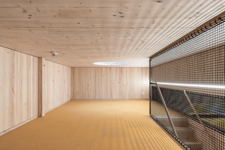 Eine zweiläufige Treppe führt in das obere Stockwerk, das sich als modularer Holzbau mit fein gearbeiteter Schindelhaut zum Hang spannt. Hier orientieren sich drei Gruppenräume für ältere Schützlinge zur Nachmittagssonne, Spielebenen mit reduzierter Raumhöhe bieten Rückzug und Geborgenheit. Ein umlaufender Laubengang, mit Blickbeziehung und Rutsche zum pulsierenden Herzstück der Anlage, lädt zum gemeinschaftlichen Toben und Spielen ein. Wie bereits im U3-Bereich verfügen alle Einheiten über angeschlossene Garderoben, Umkleiden und Sanitäranlagen, um eine entspannte Tagesroutine zu gewährleisten.