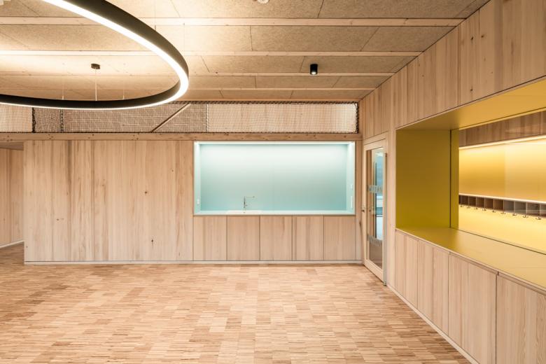 Um das physische und psychische Wohlbefinden der Kinder zu fördern, wurde die Innenausstattung in einer warmen, naturnahen Atmosphäre mit freundlichen Farbakzenten gestaltet, wobei Parkettböden und leicht gebürstete Tannentäfer auch haptische Qualitäten bieten.
