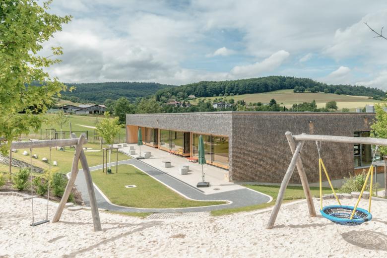 Diese Landschaft könnte tatsächlich einer Erzählung von Tolkien entsprungen sein: Eingebettet in die weiche Topographie des Odenwaldes erstreckt sich die südhessische Gemeinde Reichelsheim am Fuße des gotischen Schlosses Reichenberg. Für den Neubau der Kindertagesstätte wurde eine sonnige Parzelle am nordwestlichen Siedlungsrand ausgewählt, umgeben von walddurchsprenkelten Streuobstwiesen und den von Erlen gesäumten Auen des Eberbachs.