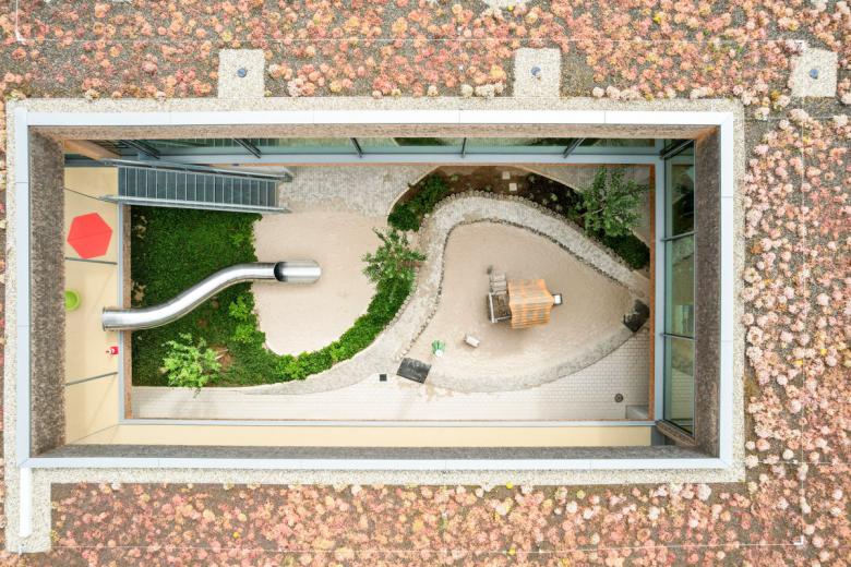 Die Lage am sanft abfallenden Nordhang birgt Herausforderungen und Potenziale. Der Baukörper entwickelt sich als markanter Solitär um ein zentrales Atrium, das als großzügig dimensionierter Spielgarten gestaltet ist. Die kluge Einbindung der Geländestruktur ermöglicht die optimale Südausrichtung aller Gruppenräume sowie ebenerdigen Zugang zu den Freiflächen auf beiden Etagen.