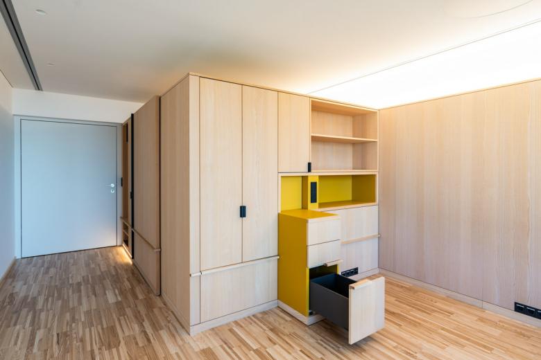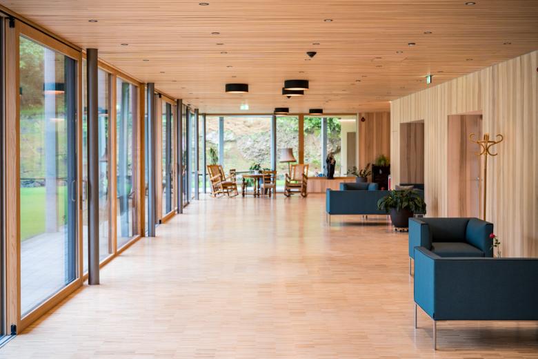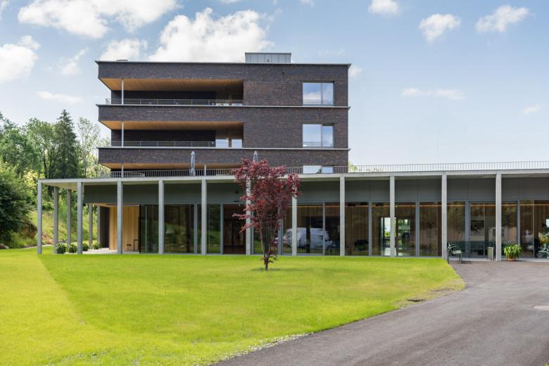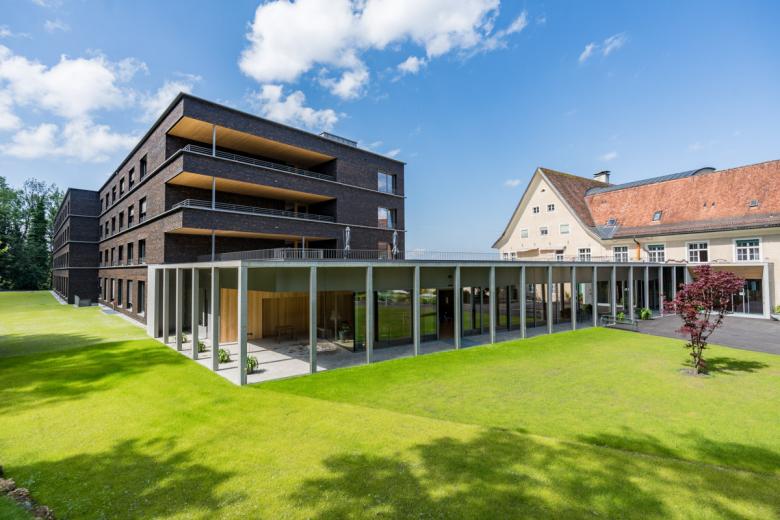 Heute präsentiert sich der Wohntrakt als zeitgemäßer Bau mit fein austarierten Proportionen und klarer Linienführung, der sich respektvoll und doch selbstbewusst in das bestehende Ensemble fügt. Die lebendige Textur der dunkel gebeizten Schindelfassade steht in bewusstem Kontrast zur hellen Putzoberfläche des historischen Hauptgebäudes. Die lichtdurchfluteten Innenräume vermitteln eine warme, einladende Atmosphäre, die das Wohlbefinden der betagten Menschen fördert. Die freundliche Farbgestaltung und Formgebung der offenen Begegnungsräume sowie der privaten Rückzugsorte tragen zu einer ruhigen und harmonischen Stimmung bei. Großzügige Fensterflächen eröffnen entspannende Ausblicke auf die sorgfältig gestalteten Grünräume und schaffen eine harmonische Verbindung zur umgebenden Natur. Die kleinen Balkone wurden durch weite Aussichtsterrassen ersetzt, die auch den weniger mobilen Senioren sonnige Stunden der Entspannung und Erholung bieten.