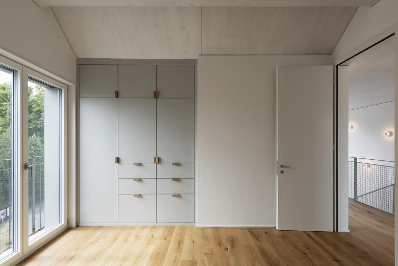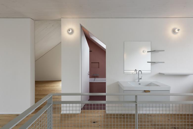 Im Bereich der Maisonettewohnung wird eine grosszügige, über zwei Stockwerk verlaufende Lukarne als neues Element eingeführt. Die Küche, der Ausgang auf die Terrasse und die Treppe ins Dachgeschoss sind darin konzentriert und bilden das Herzstück der Wohnung. Unmittelbar nicht benötigte Raumtrennungen können zu einem späteren Zeitpunkt erstellt werden, um eine Flexibilität der Nutzung zu generieren.