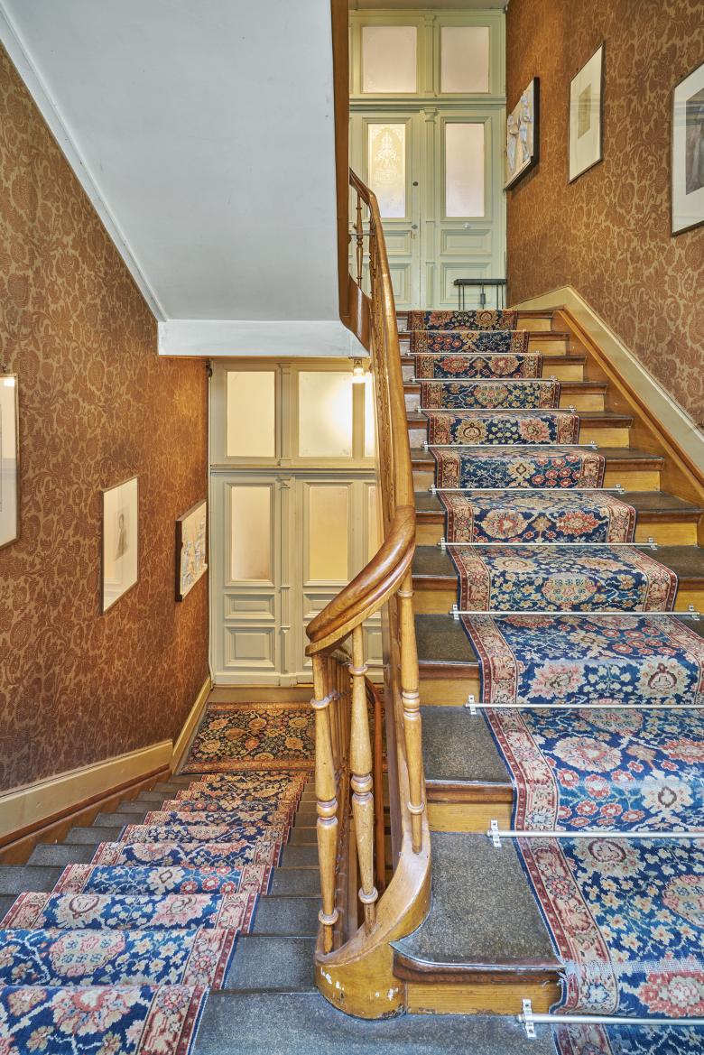 Durch die Gesamtsanierung erfährt das Gebäude eine Modernisierung hinsichtlich Gebäudetechnik und Nutzung. Die Gebäudehülle wird energetisch ertüchtigt, wobei die historisch wertvollen Fenster erhalten und fachmännisch aufgedoppelt werden. Mit der Freilegung der Natursteinelemente und inspiriert durch frühere Farbgebungen wird die Fassade neu gestaltet.