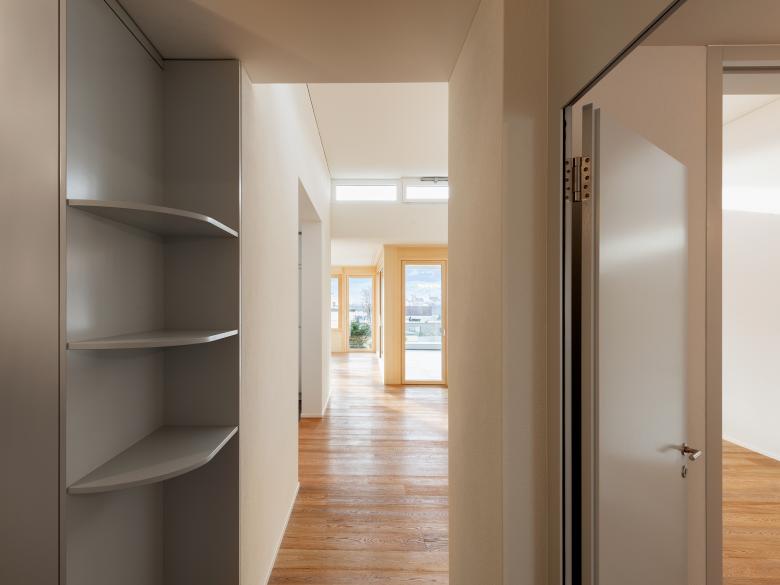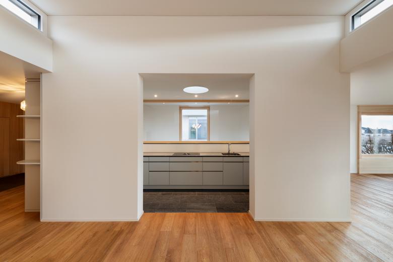 Grundriss und Raumabfolge: Die Raumabfolge im Wohngeschoss entwickelt sich von Entrée zum Esszimmer, weiter zum Wohnzimmer mit Terrasse. Der Mittelpunkt bildet das überhohe Esszimmer mit Oblicht, an welches die Küche direkt angrenzt. Das Wohnzimmer lebt vom weiten Ausblick auf den See und die Berge und dem starken Bezug zur Terrasse. Dank dem Innenausbau aus Fichtenholz, den Fenstern mit tiefer Holzleibung und den grosszügigen französischen Fenster ist der Wohnbereich trotz hohem Glasanteil sehr gemütlich. Die Überdeckung der Terrassen mit Betonlamellen führen zu einem spannenden Spiel von Licht und Schatten.
