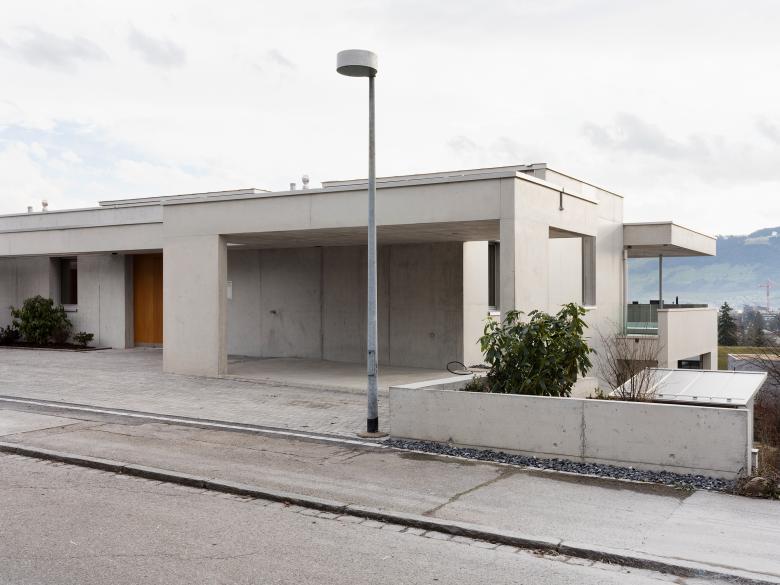 Situation: Das Zweifamilienhaus liegt in einem Wohnquartier in Hanglage. Um beiden Hausteilen Gartenzugang und Aussicht zu geben, erfolgt die Trennung der Wohneinheiten vertikal. Im oberen Stockwerk sind die Wohnräume angeordnet, im unteren Stockwerk zum Garten hin die privaten Schlafräume und Nasszellen. Das Haus bleibt zur Strasse hin zurückhaltend und schlicht, öffnet sich aber sowohl im Grundriss, wie auch im Ausdruck zur Weite des Zürichsees.