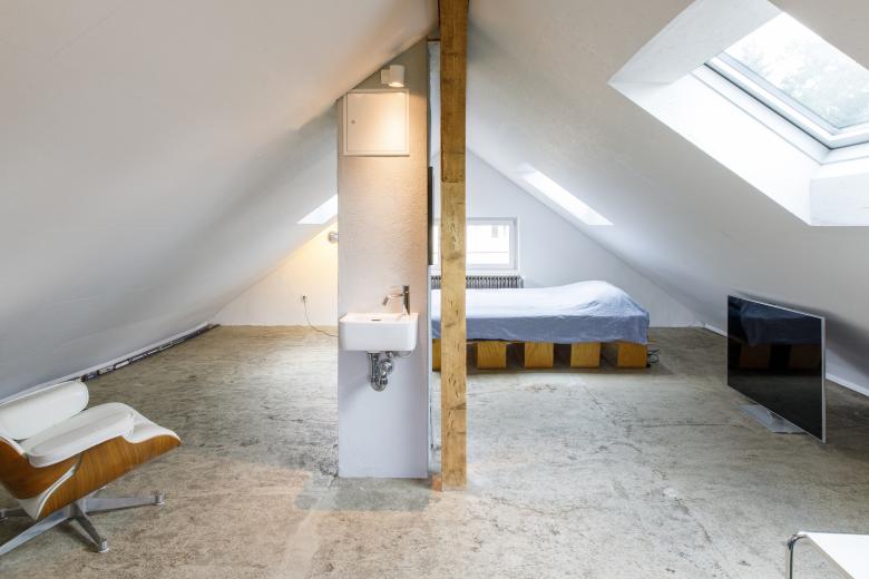 Dank dem Dachausbau ist ein zusätzliches Zimmer entstanden. Die Dachfläche wurde gedämmt und mit einer integrierten Photovoltaikanlage versehen. Die gewonnene Sonnenenergie wird für den alltäglichen Stromverbrauch, den Betrieb der Pelletheizung und für das Elektroauto verwendet.