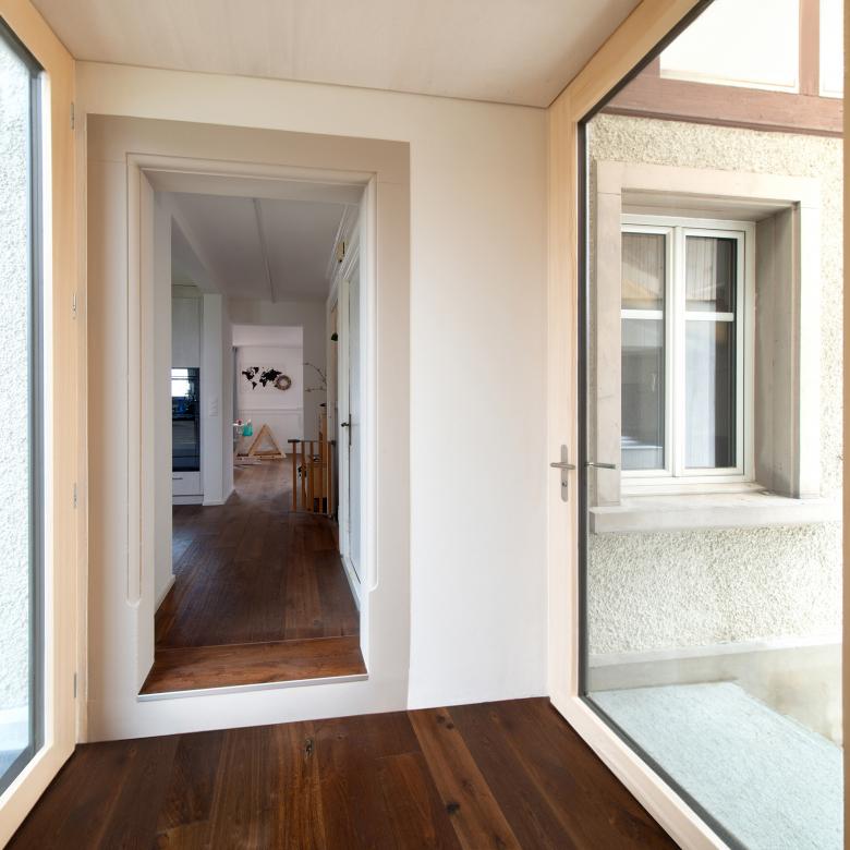 Erschlossen wird das Haus an der neu entstandenen Schnittstelle von Bestand und Anbau. Diese Schnittstelle wird als vollverglaste Fuge zwischen Neu- und Altbau inszeniert und bildet zugleich eine Passerelle im 1.Obergeschoss.