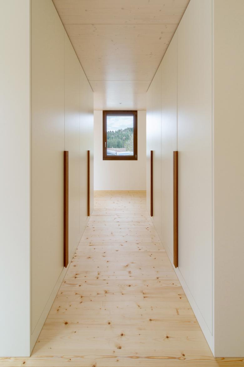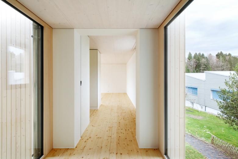 Von der Passerelle entstehen vielfältige Sichtbezüge zur Umgebung. Die Kinder der Bauherrschaft haben diesen Raum bereits für sich entdeckt und spielen oft im lichtdurchfluteten Zwischenbereich der beiden Baukörper und können von hier beobachten, wenn Gäste beim Haus eintreffen.