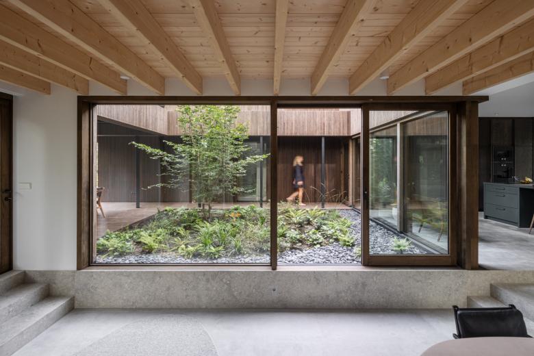 The five interconnected volumes of the villa differ in size and positioning, creating a diverse exterior appearance from all sides. The consistent minimalist detailing of the facades and canopy in clip bamboo amplifies the sculptural quality of the structure. The garden design complements the carefully crafted outdoor space, tailored to the villa's volume and facade openings, completing a harmonious interplay of architecture, interior, and landscape.