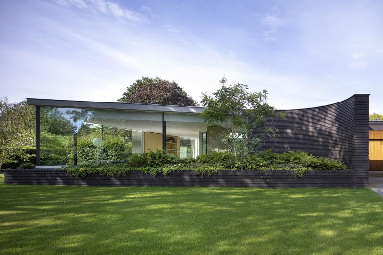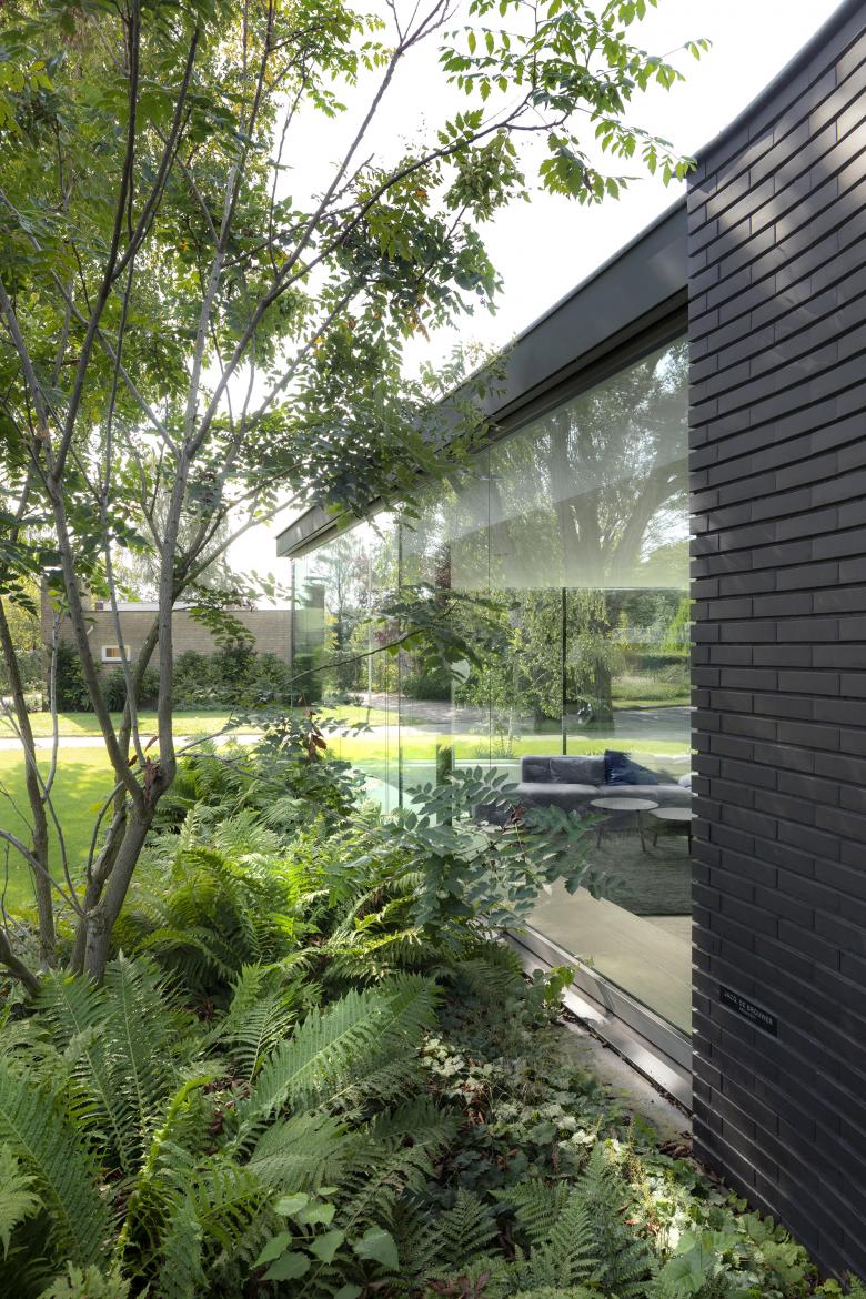 The all black brick facades hide and show its natural surroundings, and large integrated planters with greenery are integrated right at the frontside of the building. The house is built for effective use of energy, with a geothermal energy storage, a heat pump and solar collectors on the roof. The goal was to connect the inside with the outside naturally.