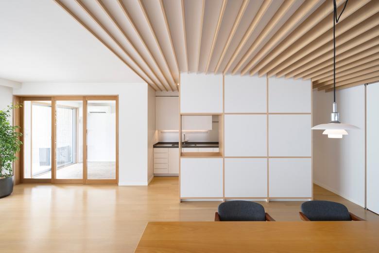 Rhythmic louvers, installed to eliminate the difference in the ceiling level, tie the dining room space together. Around the windows, shoji screens with the cleats on the reverse side allow for different views during the day and at night. In addition, bookshelves extending from the dining room to the living room connect each room, creating a sense of unity in the space. The furniture design is based on beech wood and off-white tones, and the light gray walls harmonize with the existing furniture, creating an elegant atmosphere.