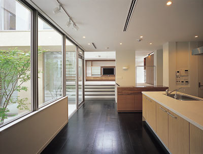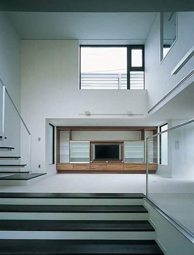 This is the court house we named "Pin wheel configuration House". 4L-shaped big walls are placed in the configuration like blade of the pinwheel. Luxurious and comfortable living spaces are provided along the L-shape walls, in the sequence of patio and the outside garden between walls.