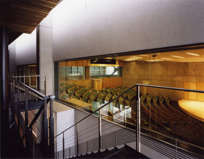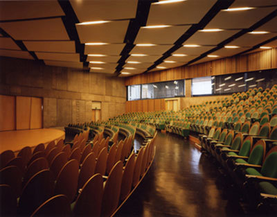 The sound insulating double glass wall is placed behind the seats that are aligned in an arc.