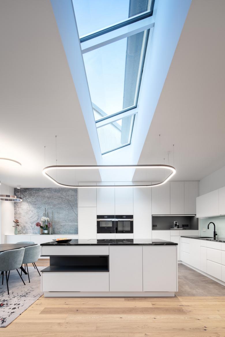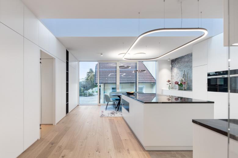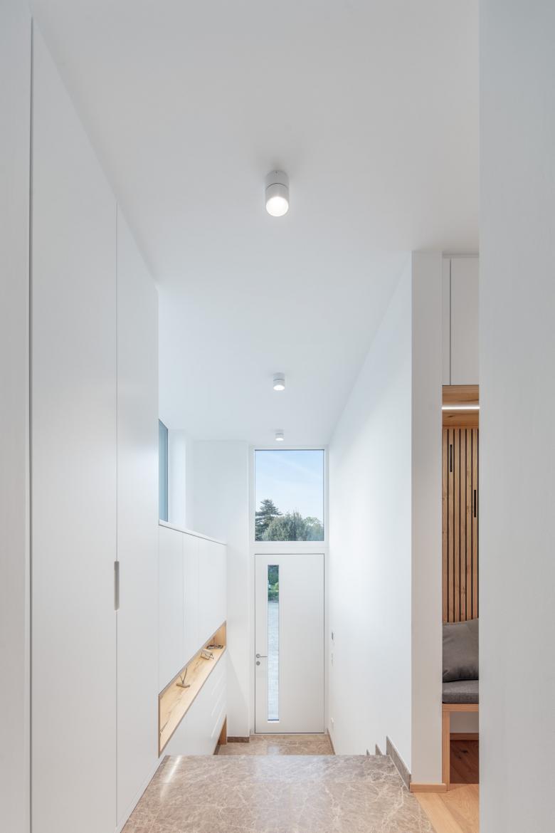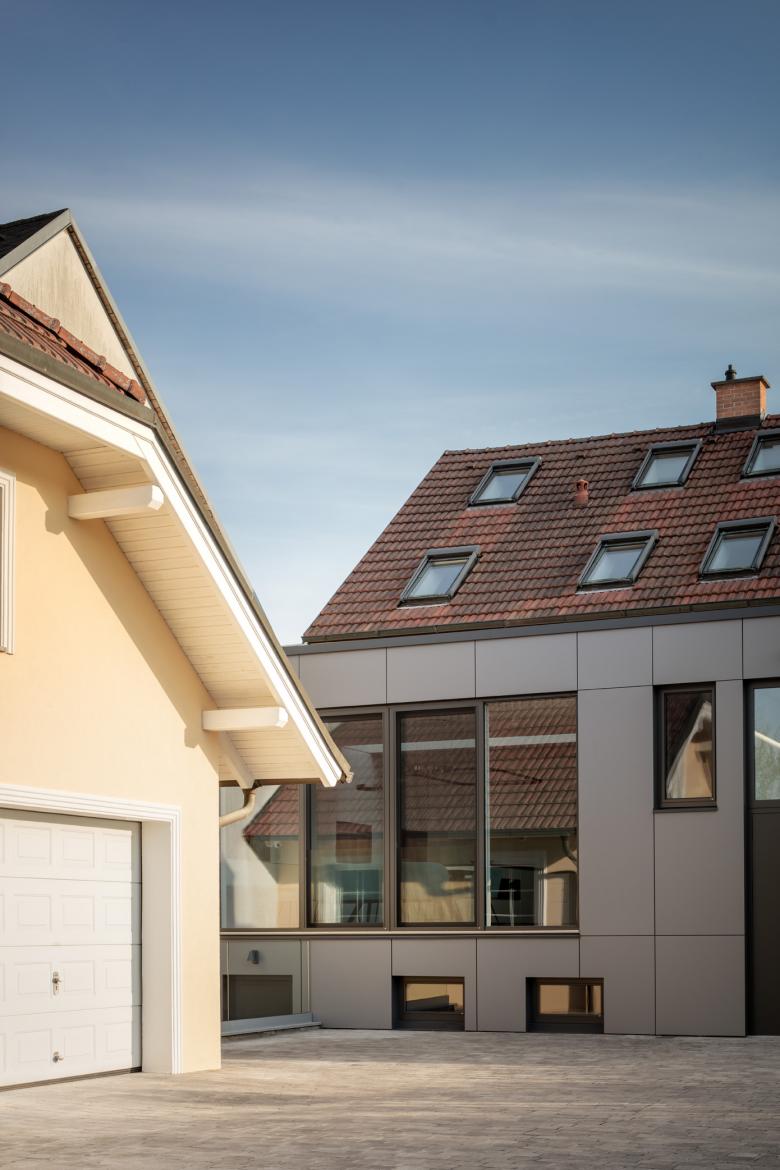 Es wurde folgende Lösung entwickelt: der Windfang wurde entfernt und auf der ganzen Fläche des nordseitigen Kellers wurde ein Holzbau errichtet. Dieser vereint nun den auf Gartenniveau liegenden Zugang mit einer Innentreppe und ermöglichte eine direkte Verbindung in die große Wohnküche. Dafür wurde in der ehemaligen Außenwand ein großer Durchbruch hergestellt. Im Innenraum ist keinerlei Trennung zwischen Altbestand und neuem Zubau abzulesen. Mittels einer großen Fensteröffnung mit raumhohen Schiebetüren wurde eine Verbindung zum nördlich gelegenen Garten realisiert.
