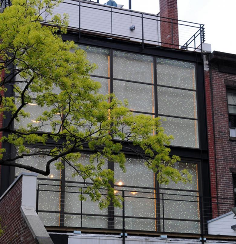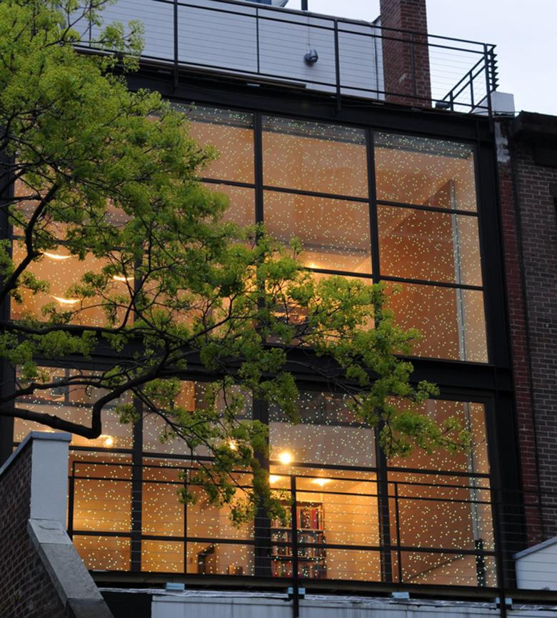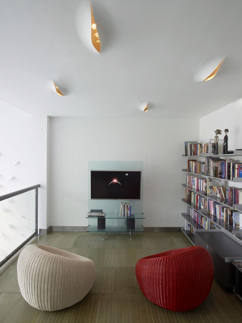The outside wall is constructed with special glass panels, in which thousands of white LEDs are embedded. They seem to float in thin air and resemble stars in the night sky. For the other interior lighting we have used Schlitz Up, which are in some cases painted on the inside with a custom yellow colour. The entrance area is lit by Wandering Finger Wall and an Oh Mei Ma in Silver (not shown) These are both available from our standard collection.