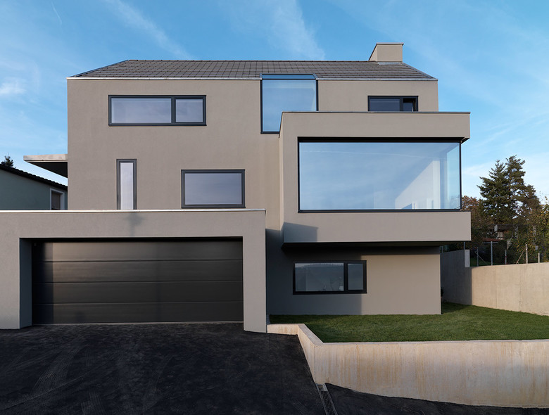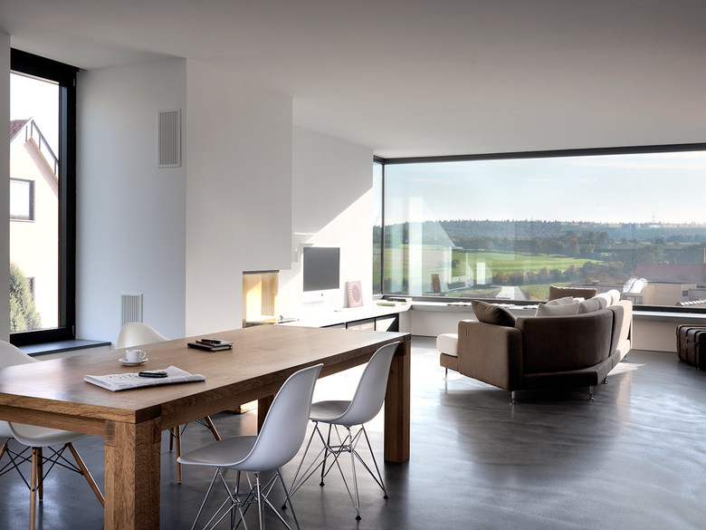 The view from the L-shaped panoramic window over the 900 year old village of Denkendorf, with its abbey in the centre, attracts everyone‘s attention. The heated window ledge of fairfaced concrete is therefore the most populär seat in the house. Clearly defined, minimalist in its form and material, the trapeze shaped three floor residential and office premise may appear cool at first glance. The large Windows open up the massive building, which init-ially seems quite closed, and allow views in and out from every aspect. Projecting parts of the building such as Win¬dows and garage, bring a rhythm to the facade and play-ful elements into the severe architecture. The projecting glass structure provides the living room with the neces-sary generous space, without increasing the total area of the house and therefore the building costs. The facade is plastered smooth grey. The tiled roof continues this co-lour and the building appears to be of one piece. Gutters and down pipes have been concealed. The anthracite co-loured aluminium framed Windows, Hush with the facade, modelled on Swiss design create a smooth, homogenous appearance. Cooking, eating and living area flow into one without the interruption of Supports or walls. The stairs form the core ofthe main living area, connecting the three floors and the various living areas. The kitchen faces the garden and opens on to the dining and living room. Adja-cent is a Utility room.