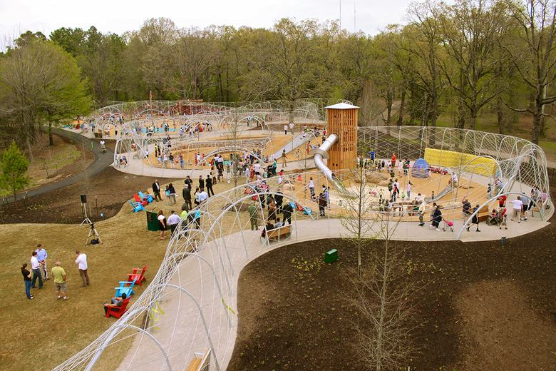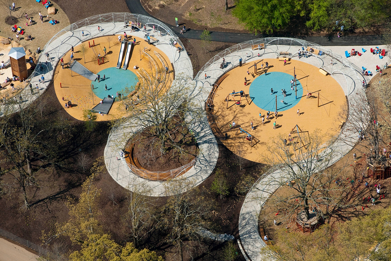 The design for the Woodland Discovery Playground is intended to foster play and discovery, embracing fun and delight while cultivating healthy development of children’s physical and social well-being.  Set within a natural woodland context, the playground provides an environment that promotes interaction and engagement -- children must enter, move around and look for opportunities to slide, climb, run, scramble, swing, build, find and discover.