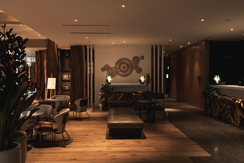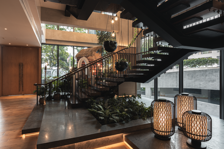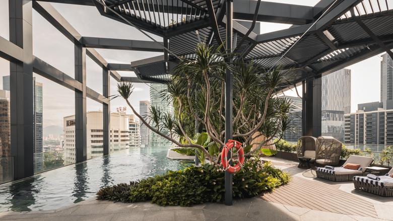 The interior spaces were designed taking account of the cultural variety of Malaysia. Furniture, surfaces and details reflect typical motifs and materials of the region without feeling too decorative. The lobby, whose reception counter is made of weathered burl wood, is laid out as a generous entrance area with a planted wall module. Recycled materials such as glass surfaces and old metal have been consciously used. Even the main stairs was made from old railway sleepers. The combination of raw material and careful preparation extends through all the public areas. On the roof, an open relaxation area has been constructed with a pool. A geometrically designed metal structure filters the light. Planted areas, sunken plant troughs and natural materials complement the concept, with the design following a clear system without seeming artificial.
