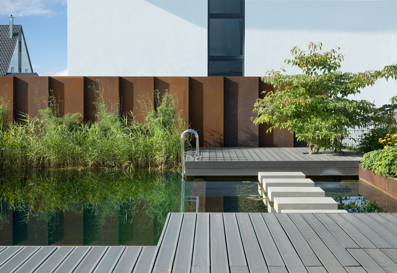 Im Süden wird die großzügige Terrasse durch einen Schwimmteich ergänzt. Über steinerne Trittplatten gelangt man trockenen Fußes zu den an der Südgrenze liegenden Freisitzen.
