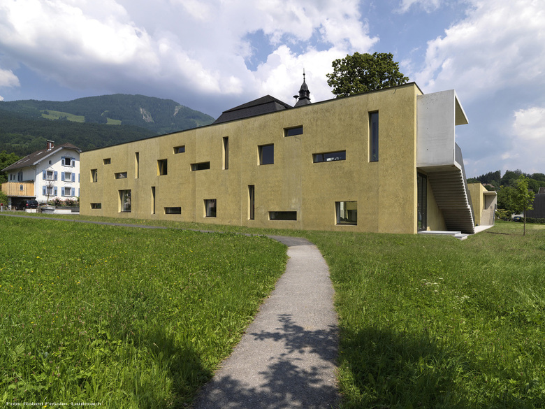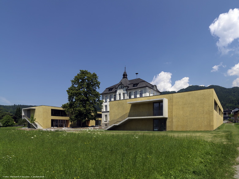 Das 100-jahre alte Schulhaus wurde komplett renoviert und bildet das zentrale Element des neuen Ensembles. Flankiert von den beiden bewußt flach gehaltenen neuen Baukörpern für Kindergarten zur einen und Volksschulerweiterung mit Sporthalle zur anderen ergibt sich ein, für alle nutzbarer, geschützter Freibereich um die alte Linde im Süden. Die OSB-Plattenschalung verleiht der ockerfarbenen Sichtbetonfassade ihre lebhafte Struktur. Im Innenraum dominiert die unbehandelte Weisstanne.