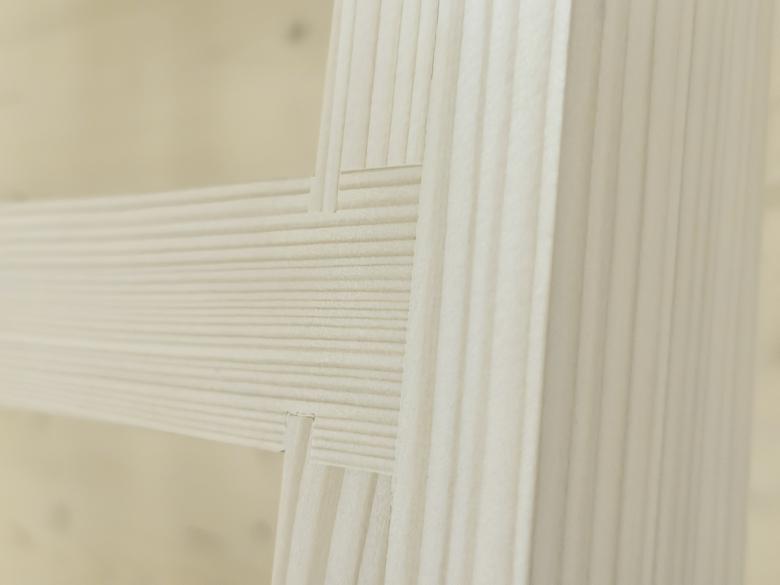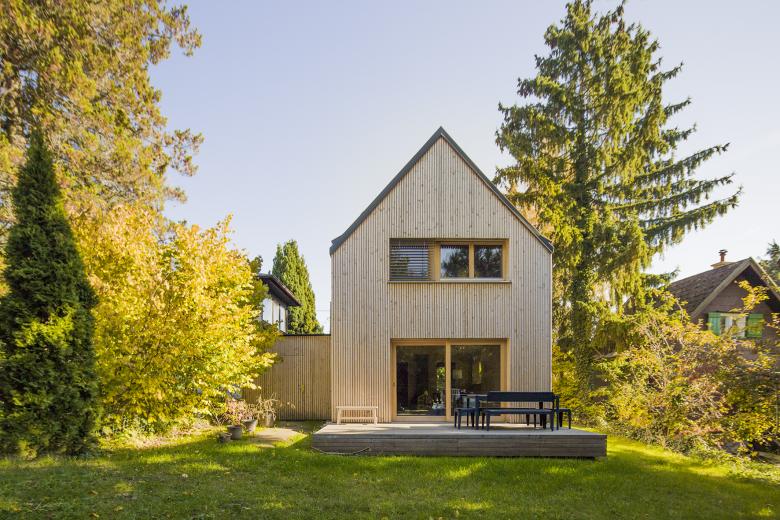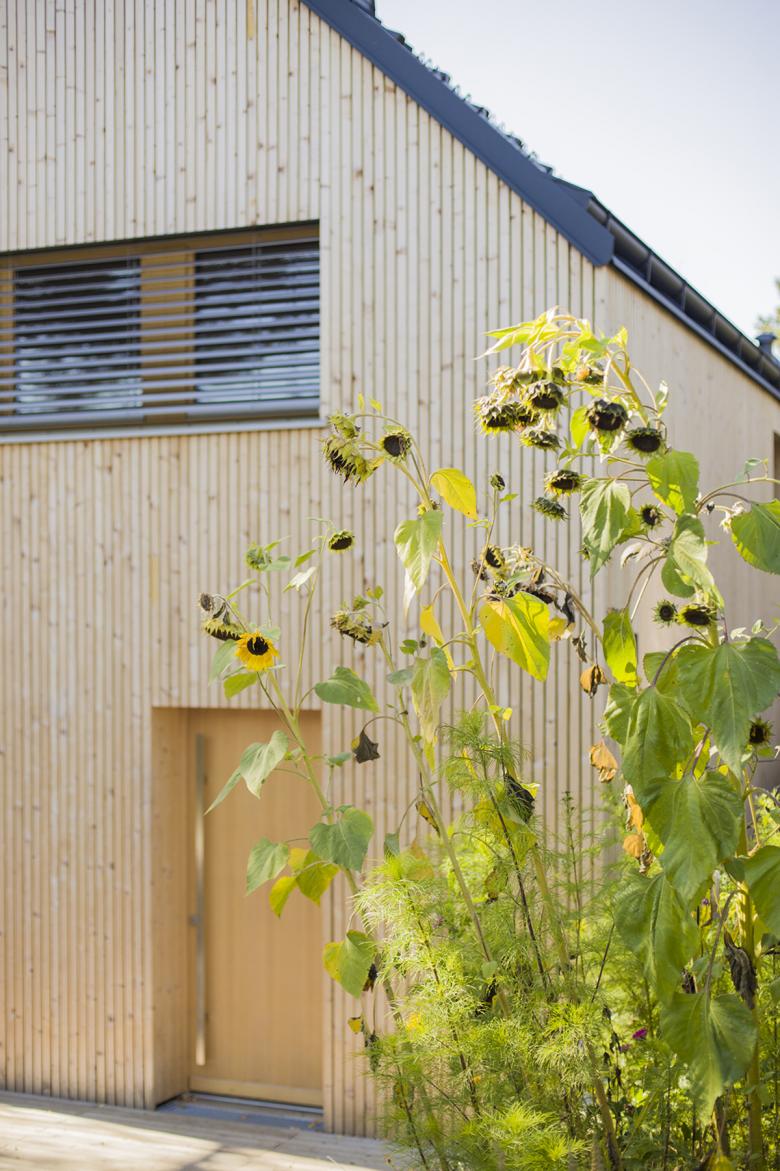 Holzoberflächen prägen das Äußere sowie das Innere des Gebäudes. Die Massivholzwände sind im Inneren als Sichtflächen belassen. Die vertikale Lattung aus Fichtenholz bildet die Fassade. Das Gebäude ist mit einer Luft-Wärmepumpe und einer südseitig in das Dach integrierten PV-Anlage ausgestattet.