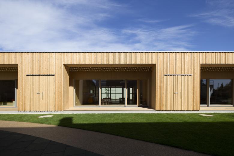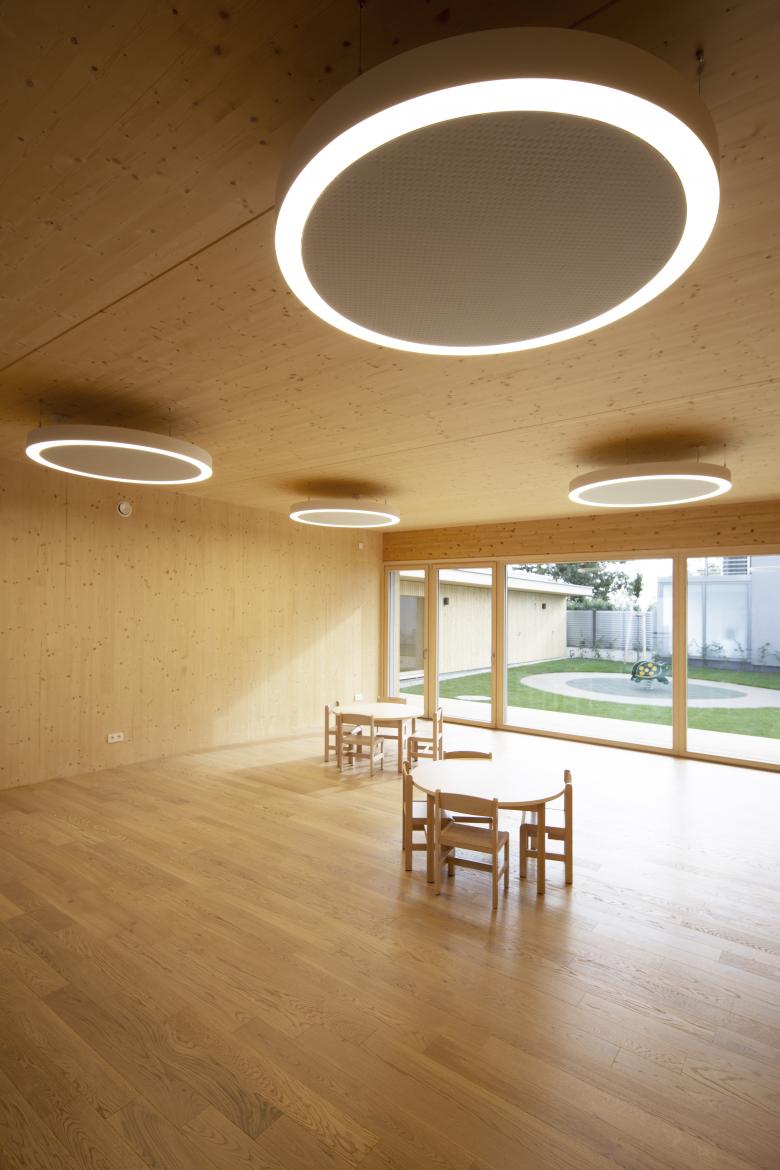The kindergarten, built in solid wood construction, is a quiet, single-storey building in a heterogeneous environment. The eastern forecourt connects to the public space and leads to the entrance area, which forms a clear closure to the playground and gardens and thus serves as a visual and noise barrier.