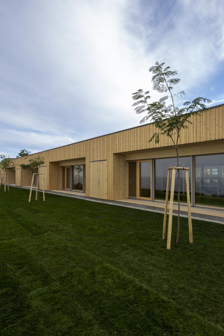 The rhythm of the adjoining rooms is such that they can be manufactured and transported as prefabricated room modules. The rooms in between are proportioned in such a way that they can be spanned without supports with cross-laminated solid wood ceilings. In the choice of materials, special emphasis was placed on renewable and ecological building materials. Domestic spruce wood was used untreated and used in a wide variety of surface structures.