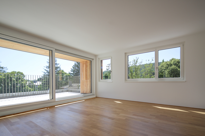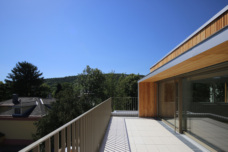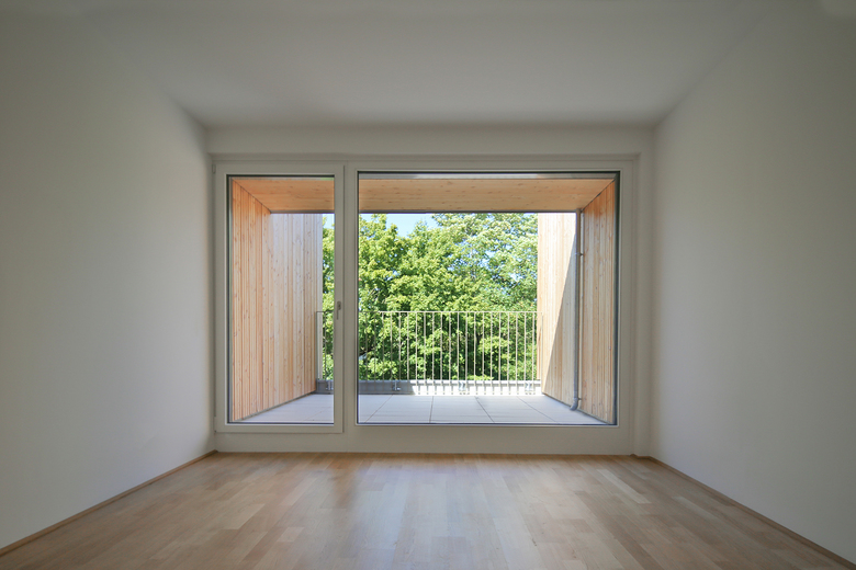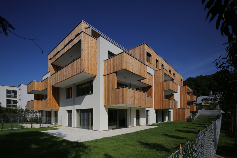 Alle 20 Wohnungen verfügen über großzügige private Freibereiche mit Blick ins Grün. Die auskragenden Gebäudeteile sowie das Dachgeschoss sind in Lärchenholz verkleidet. Alle Dachflächen wurden begrünt. Der Heizwärmebedarf von 20,6 kWh/m²a entspricht Niedrigstenergiehausstandard. Eine große Solaranlage am Dach liefert Warmwasser aus Sonnenenergie.