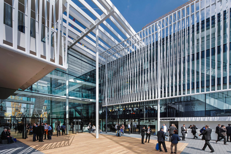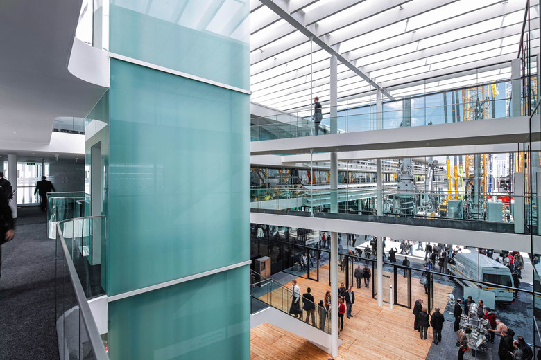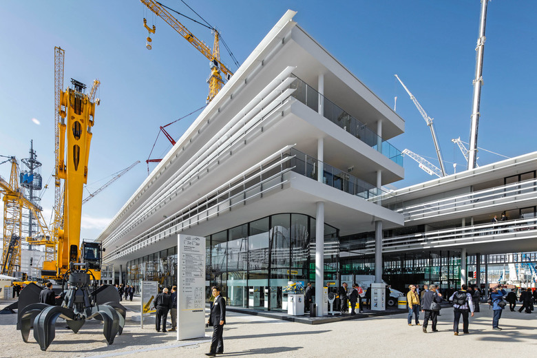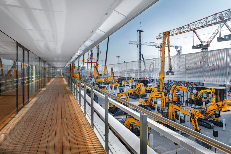 The building structure with all interior facilities arranged in two slim blocks running the full length of the site is integrated formally into the screen. Since these are raised on columns, the visitor approaching the stand has an unobstructed view across more than 13,500 square metres of display area and the many interesting construction machines exhibited there. Right where the blocks are crossing there is the main entrance and a plaza with special highlight exhibits.