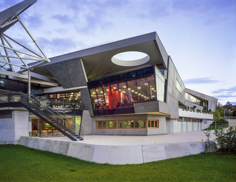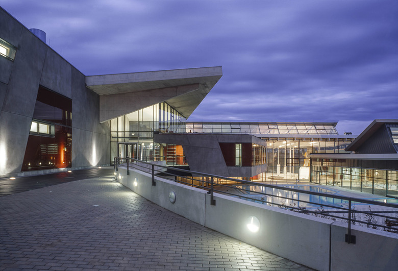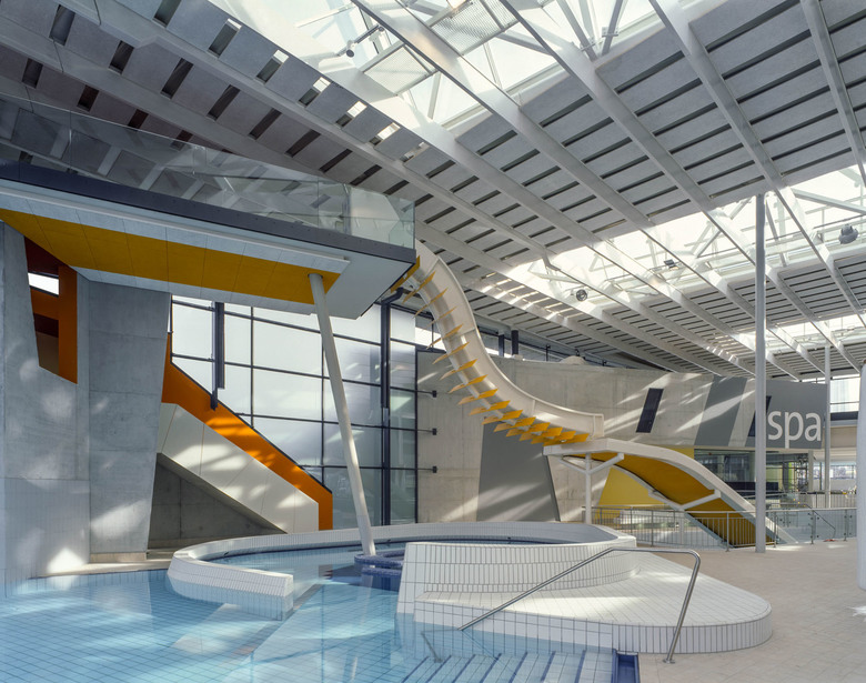 The landscape swimming area of the water park follows the natural slope topography of the exterior area. By floor-to-ceiling glazing which go easily interlock from the interior to the exterior. The swimming hall was enlarged to north from the existing building. The new building attains a maximum exposure and insolation from east and west and the orientation was reduced to the north. Significant south-sheds provide additional insolation. Various use areas such as restaurant, children's area, deck and rest area, different water areas and water attractions give the landscape differentiated atmospheres. Among other things, there is a wave pool, a flow channel, as well as several large slides. In addition to two tube slides - a black hole slide and a tire slide - there is a novel jump-street slide. The existing sports spa by the old Fildorado, with a 25-meter pool, the thermal pool in the outer area and sunbathing and relaxation area with tanning was de-bathing in the new landscape involved. Old and new merge into an interior single unit.