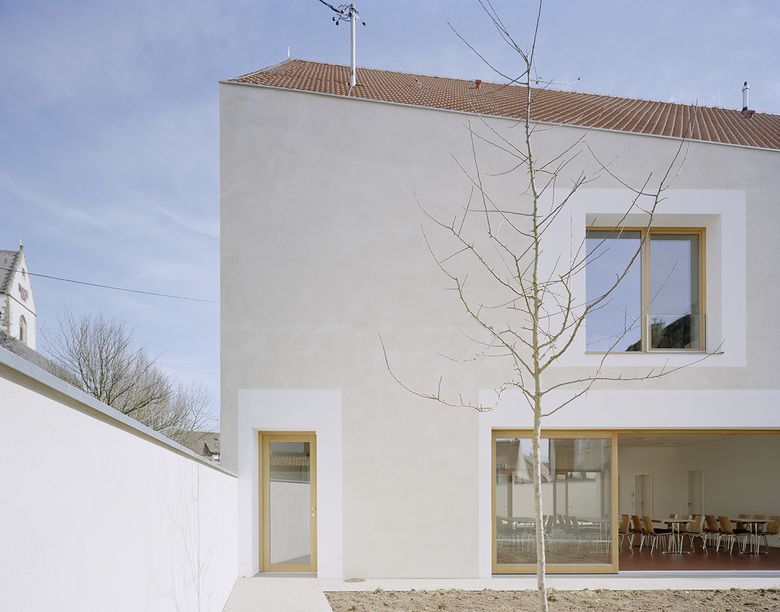 By architectonic interventions like the solid construction of the buildings volume and the size of openings in walls, habitual perception patterns are challenged and indicate the special use of the new parish hall in the village context. A steep roof with double plain tile covering and plastered walls establish references to rural and traditional building. Few large scale windows with trim moulding allow views in and out.