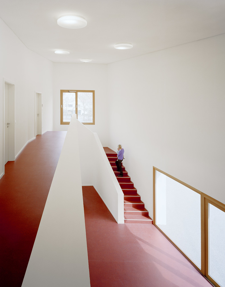 The interior surfaces are smooth and without joints. They stand in contrast to the outer form of the structure. In the foyer the buildings volume can be grasped. The gallery on the upper floor brings an alleyway to mind from which three chambers can be accessed.