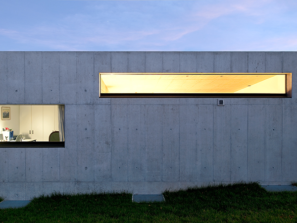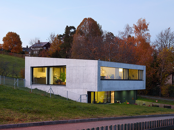 Die klare Geometrie des Baukörpers wird durch eine ruhige Materialisierung unterstrichen. Sichtbeton und grossflächige Holz-Metallfenster prägen die äussere Erscheinung, die Innenräume wurden mit Weissputz, Decken in Sichtbeton, Gussboden und Glasmosaik im Bad ausgeführt.
